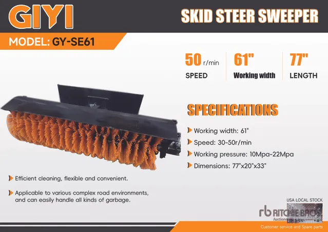 2026 GIYI GY-SE61 61 in (Unused)For Sale by Auction in TexasView bidding page Add to Watchlist Ritchie Bros. Auctioneers Bidding starts in: 1 day Item location: Lake Worth, Texas, United States Details Seller Info 2026 GIYI GY-SE61 61 in (Unused) Item Details Lot:N/A Bidding starts at: 2026-01-14T14:00:00.000000Z (GMT) Bidding ends at: 2026-01-17T01:00:00.000000Z (GMT) Auction: Texas Regional Event, USA Ritchie Bros. Auctioneers