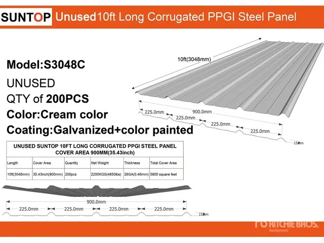 Quantity of (200) 2025 SUNTOP S3048C Corrugated PPGI Steel Panels (Unused)For Sale by Auction in TexasView bidding page Ritchie Bros. Auctioneers Bidding ended : 1 day ago Item location: Humble, Texas, United States Details Seller Info Quantity of (200) 2025 SUNTOP S3048C Corrugated PPGI Steel Panels (Unused) Item Details Lot:N/A Bidding starts at: 2026-01-14T14:00:00.000000Z (GMT) Bidding ends at: 2026-01-17T01:00:00.000000Z (GMT) Auction: Texas Regional Event, USA Ritchie Bros. Auctioneers