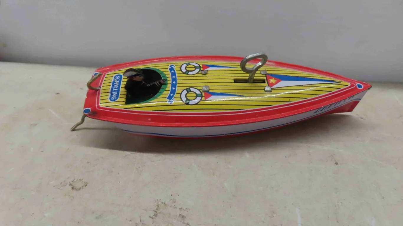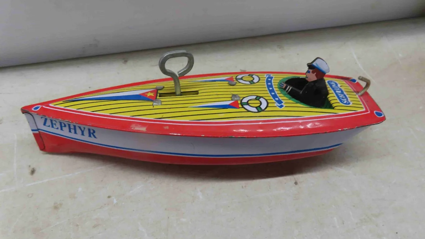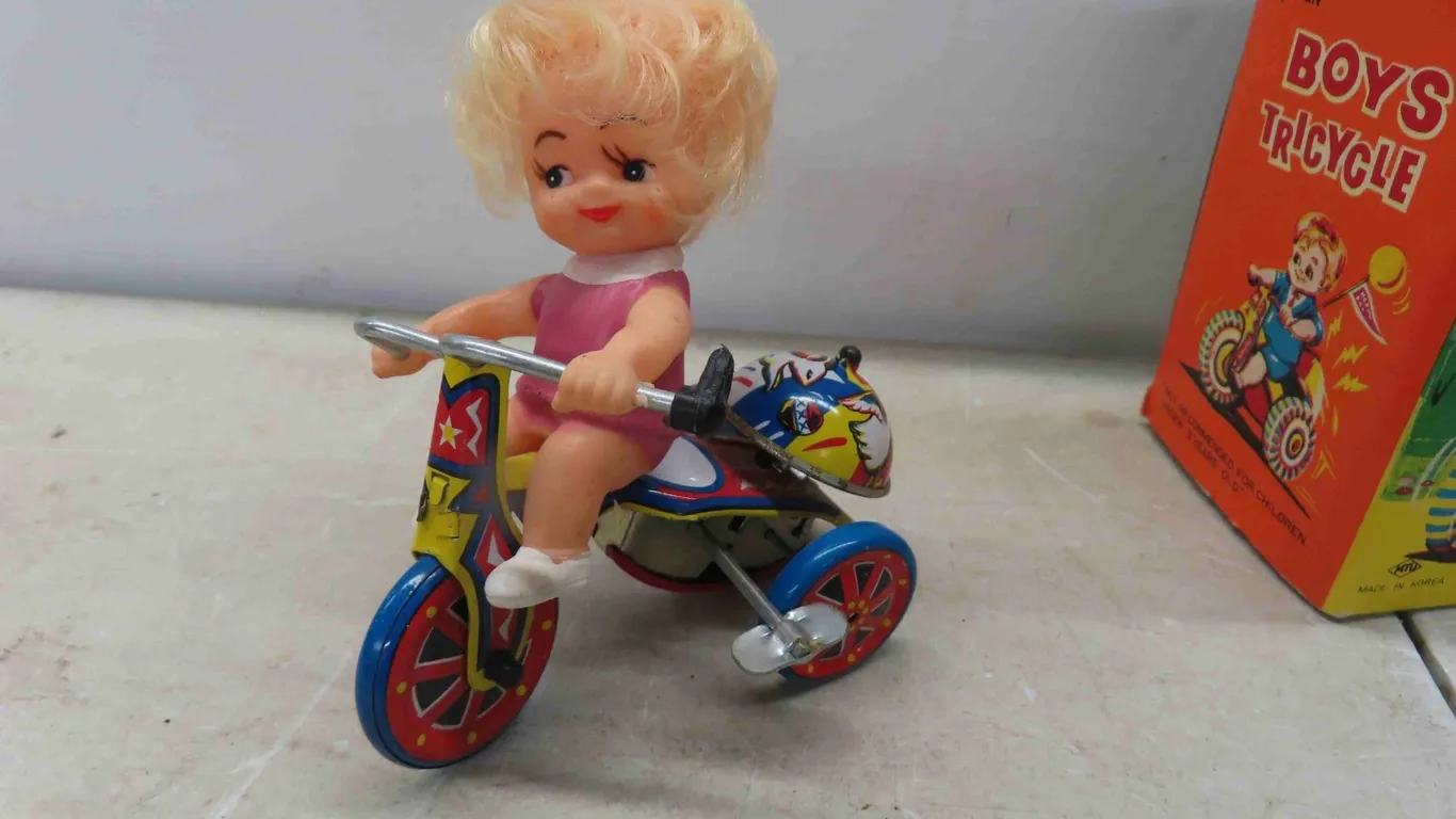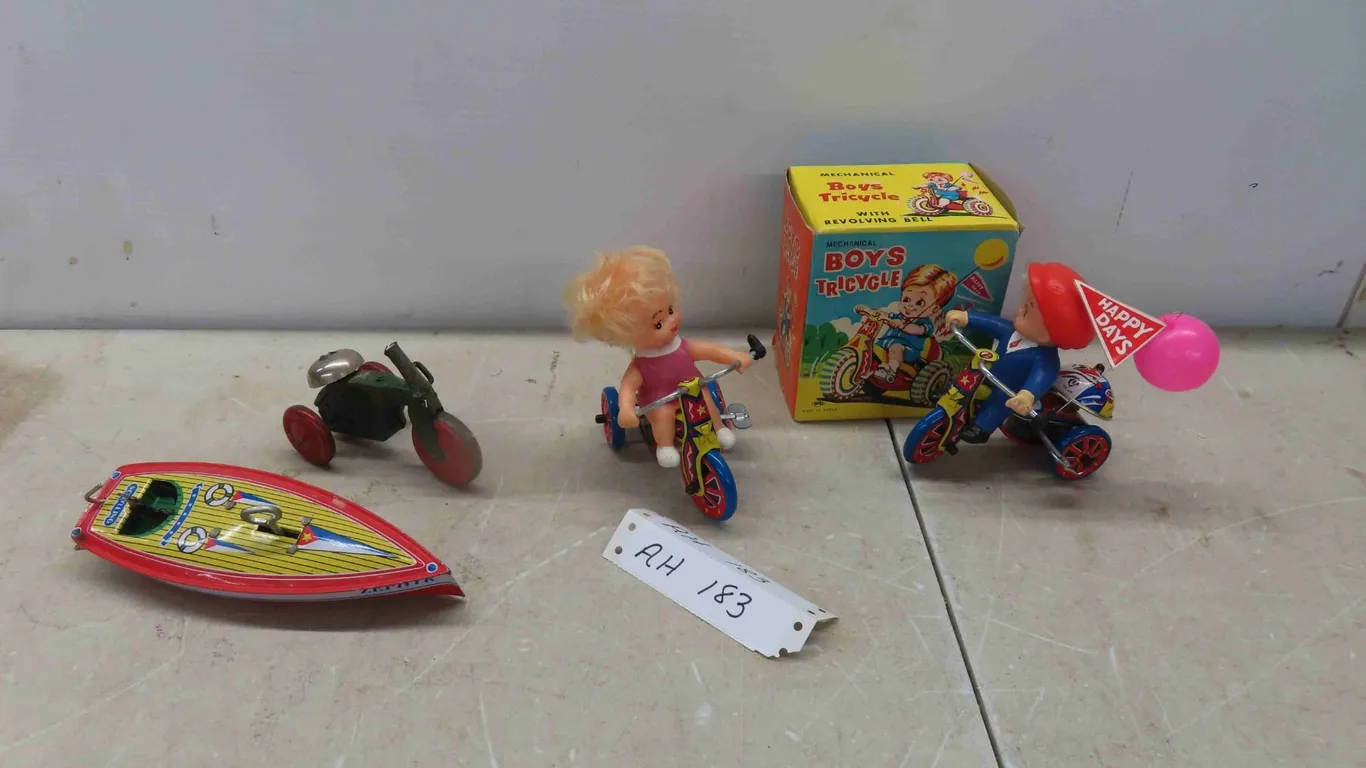 Tin Wind Up Toys : Vintage Wind Up Tricycle , Mechanical Boys Tricycle with Original Box , Girl on Tricycle , Zephyr Speed Boat